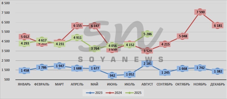 За период с января 2023г. объём производства кормовых добавок для непродуктивных животных, зафиксированный в июне 2023г. (942 тонны), стал минимальным, обращает внимание SoyaNews. Максимальный же объём данного продукта произведен в ноябре 2024г. - 7 590 тонн.