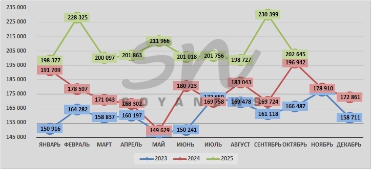 За период с января 2023г. минимальная цена премиксов была зафиксирована в мае 2023г. - 148,5 тыс.руб./т, отмечает SoyaNews. Максимальной ценой за данный период стала цена сентября 2025 года - 230,4 тыс.руб./т.