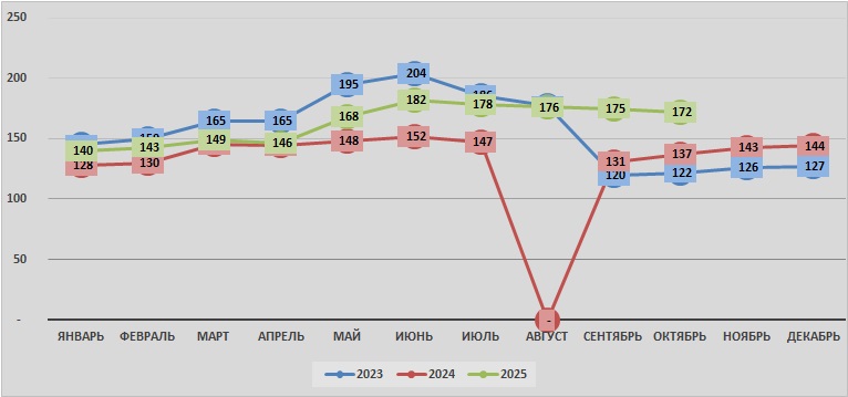 В октябре 2025г. в России** произвели 172 тонны комбикормов для дичи - это на 1,7% меньше, чем месяцем ранее, и на 25,5% больше, чем в октябре 2024г.