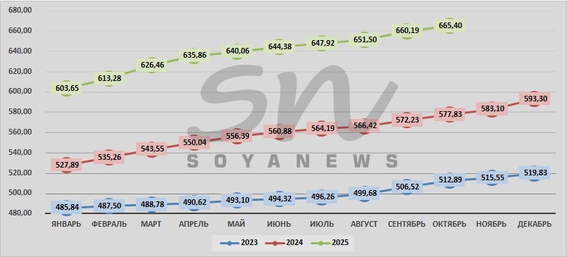 За период с января 2023г. минимальная цена на говядину зафиксирована в январе 2023г. - 485,84 руб./кг, отмечает SoyaNews; максимальная - в октябре 2025г.: 665,40 руб./кг.