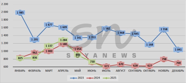 За период с января 2023г. максимальный объём производства ЗЦМ зафиксирован в январе 2023г. (1985 тонн), отмечает SoyaNews; минимальный - в августе 2025г.: 379 тонн.