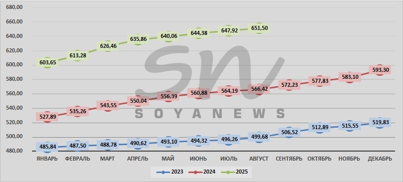 За период с января 2023г. минимальная цена на говядину зафиксирована в январе 2023г. - 485,84 руб./кг, отмечает SoyaNews; максимальная - в августе 2025г.: 651,50 руб./кг.