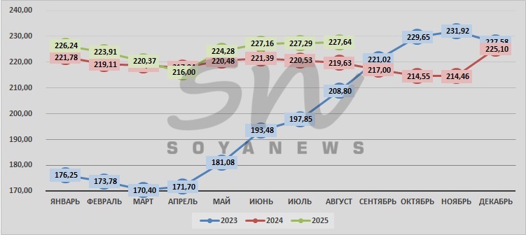 За период с января 2023 года минимальная цена на кур в России была зафиксирована в марте 2023г. - 170,40 руб./кг, подчёркивает SoyaNews; максимальная - в ноябре 2023г. - 231,92 руб./кг.