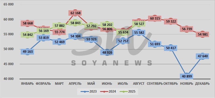 Средняя цена мясокостной муки в России* в августе 2025г. составила 58,5 тыс.руб./т. Это на 5,2% больше, чем в предыдущем месяце, и на 1,0% меньше, чем в августе 2024г. С начала года цена выросла на 6,7%.