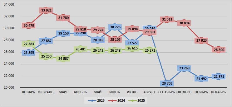 Средняя цена жмыхов в России* в августе 2025г. установилась на уровне 26,3 тыс.руб./т. Это на 1,3% меньше, чем в предыдущем месяце, и на 10,5% меньше, чем в августе 2024 года. С начала года цена снизилась на 4,1%.