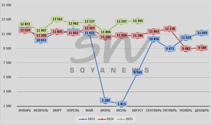 За период с января 2023г. объём производства лизина, зафиксированный в июле 2023г. (1,8 тыс.тонн), стал минимальным, обращает внимание SoyaNews. Максимальный же объём данного продукта произведен в марте 2025г. - 13,6 тыс.тонн.