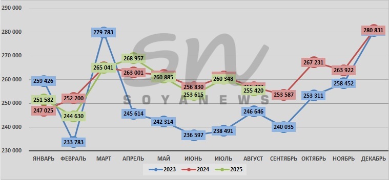 За период с января 2023г. минимальный объём производства комбикормов для КРС в России был зафиксирован в феврале 2023г. - 233,8 тыс.тонн; в декабре 2023 года достигнут максимум - 280,4 тыс.тонн, напоминает SoyaNews.