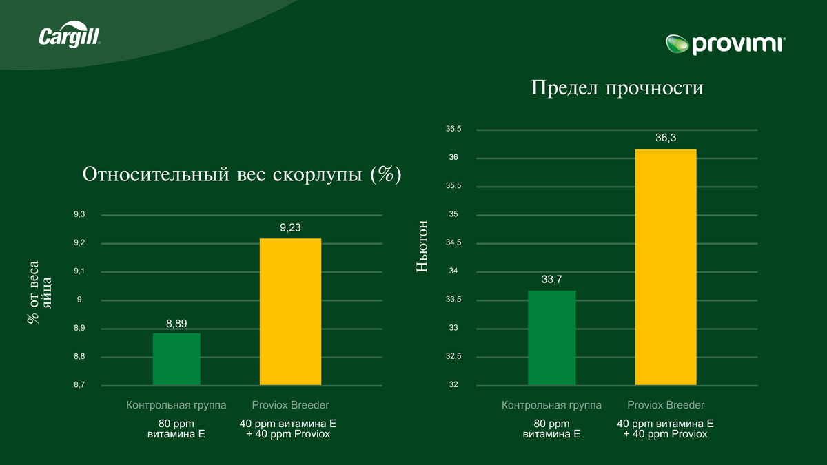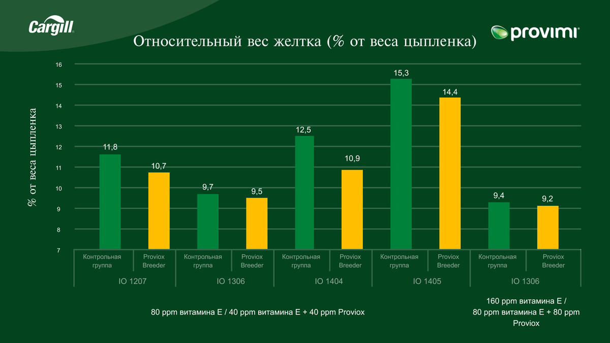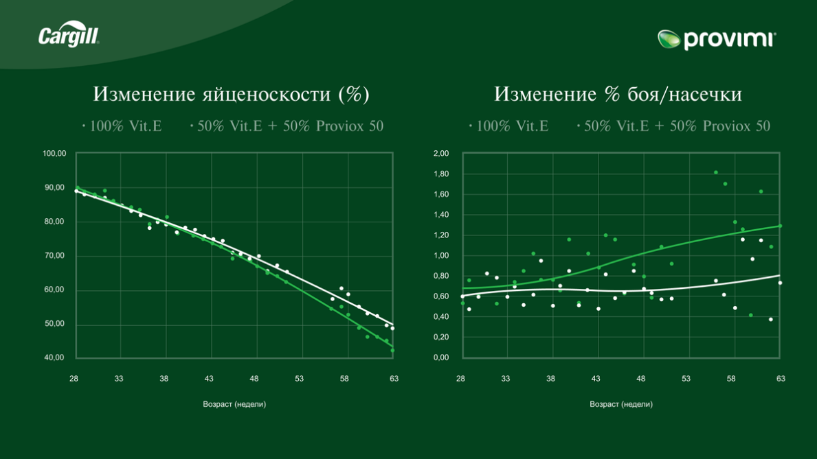 В портфолио Cargill имеется продукт «Провиокс 50», содержащий полифенолы растительного происхождения. Его можно использовать для частичной замены витамина Е в пропорции 1:1 или в качестве дополнительной антиоксидантной защиты организма птицы. В данной статье представлены результаты опытов с «Провиокс» на родительских стадах бройлеров.