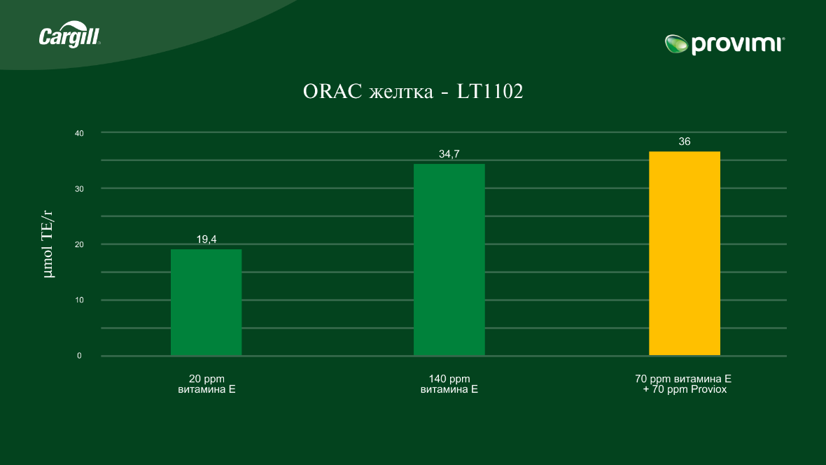 При измерении кислородно-восстанавливающей антиоксидантной способности (ORAC) желтка фиксировалось ее увеличение при замене 50 % витамине Е на «Провиокс».
