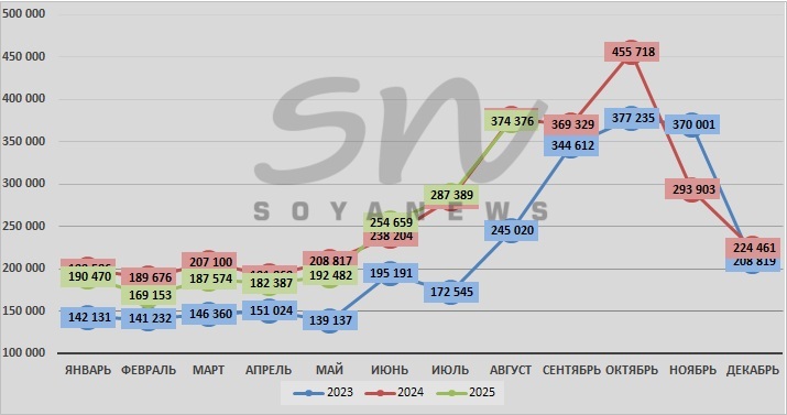 За период с января 2023г. минимальный объём производства растительных кормов в нашей стране зарегистрирован в мае 2023г. - 139,2 тыс.тонн, обращает внимание SoyaNews; максимальным стал объём производства, достигнутый в октябре 2024г. - 455,7 тыс.тонн.