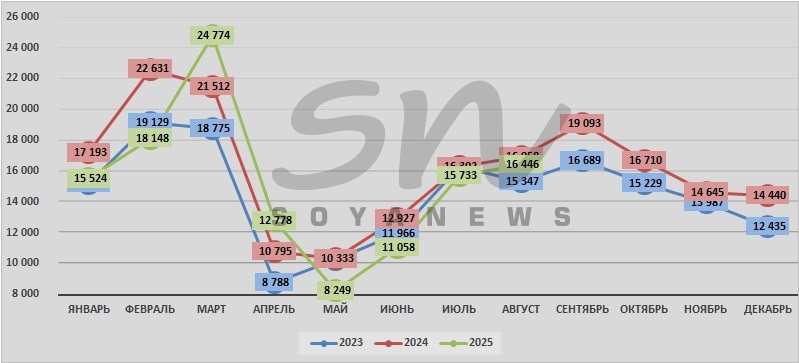 За период с января 2023г. минимальный объём производства рыбной муки зафиксирован в мае 2025г.: 8,2 тыс.тонн, отмечает SoyaNews; максимальный - в марте 2025г.: 24,8 тыс.тонн.