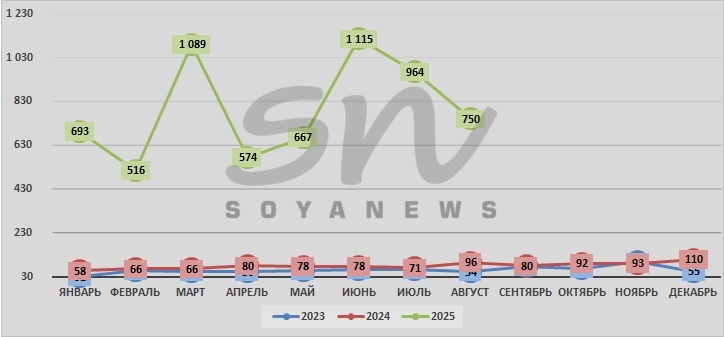 За период с января 2023г. максимальный объём производства комбикормов для лошадей был достигнут в июне 2025г. (1115 тонн), уточняет SoyaNews. Минимальным стал объём производства января 2023г. - 31 тонна.