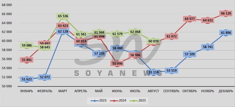 За период с января 2023г. минимальный объём производства мясокостной муки в России зафиксирован в январе 2023г. - 51,6 тыс.тонн, обращает внимание SoyaNews; максимальным стал объём производства, достигнутый в декабре 2024г. - 66,1 тыс.тонн.