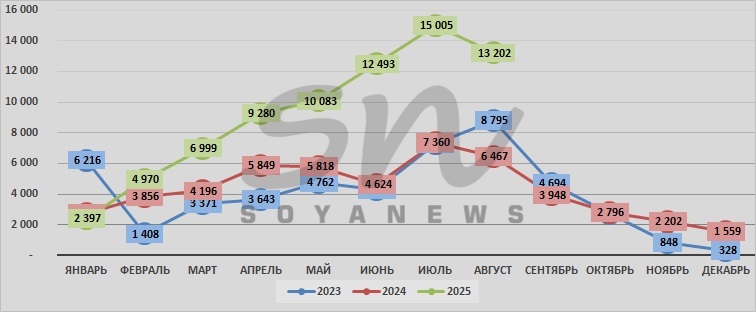 Объём производства комбикормов для рыб в России** в августе 2025г составил 13,2 тыс.тонн - на 12,0% меньше, чем в предыдущем месяце, и в 2,04 раза больше, чем в августе 2024 года.