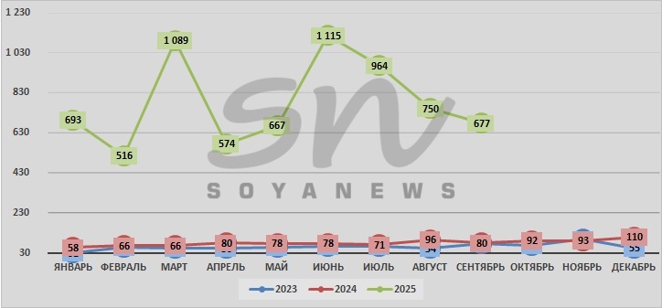 За период с января 2023г. максимальный объём производства комбикормов для лошадей был достигнут в июне 2025г. (1115 тонн), уточняет SoyaNews. Минимальным стал объём производства января 2023г. - 31 тонна.