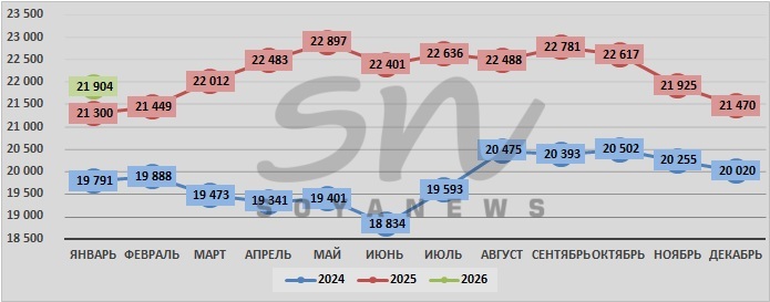 Средняя цена комбикормов для КРС в России* в январе 2026г. составила 21,9 тыс.руб./т. - это на 2,0% больше, чем месяцем ранее, и на 2,8% больше, чем в январе 2025 года.