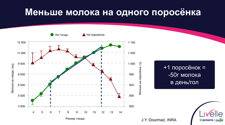На лактацию приходится от 15 до 20% продуктивного цикла, однако, это наиболее сложный период с точки зрения метаболизма, где значительная часть всех потребностей свиноматки приходится на выработку молока. Несмотря на рост его производства с увеличением размера гнезда, количество молока на одного поросенка будет снижаться (рис. 1).