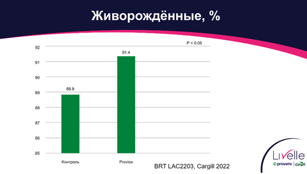 - комбинация Витамин Е + Proviox®. Оксидативный стресс, в котором всегда находится свиноматка, негативно влияет как на ее здоровье, так и на жизнеспособность поросят. Исследованиями Каргилл было отмечено, что дополнительный ввод Proviox® в кормление свиноматок повышал жизнеспособность поросят до +3% (рис. 8).