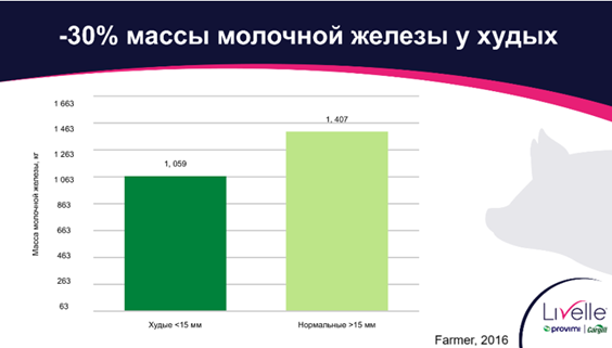 Крайне важно контролировать кондицию ремонтных свинок и свиноматок на каждом этапе производственного цикла, поскольку от этого напрямую зависит развитие молочной железы. Свиноматка/ремонтная свинка с толщиной шпика менее 15 мм в конце супоросности имеет значительно меньшую массу ткани молочной железы (рис. 2).
