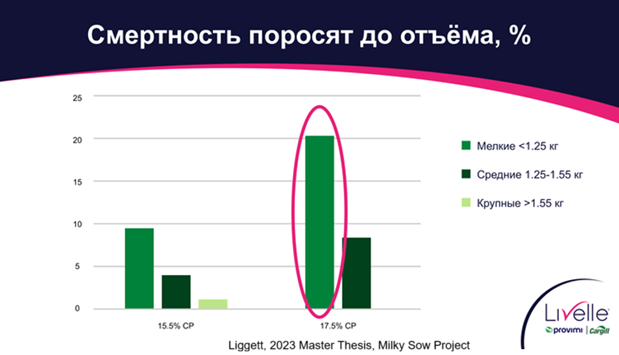 снижение уровня сырого протеина. Установлено, что высокий уровень протеина в рационе лактирующей свиноматки вызывает воспалительные процессы в ЖКТ как у самой свиноматки, так и у поросят и также наблюдается высокая смертность поросят (в 2 раза выше!!) до отъема от свиноматок на высокопротеиновом корме (сырой протеин более 15.5-16%) (рис. 6).