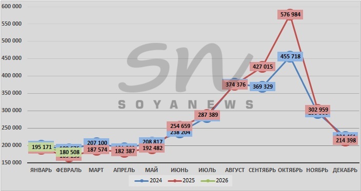 За период с января 2024г. минимальный объём производства растительных кормов в нашей стране зарегистрирован в феврале 2025г. - 169,2 тыс.тонн, обращает внимание SoyaNews; максимальным стал объём производства, достигнутый в октябре 2025г. - 577,0 тыс.тонн.