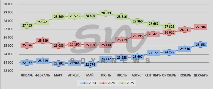 За период с января 2023г. минимальная цена на комбикорма для птиц в России зафиксирована в марте 2023г. - 22,9 тыс.руб/т, обращает внимание SoyaNews; максимальная зарегистрирована в июне 2025г. - 28,9 тыс.руб./т.