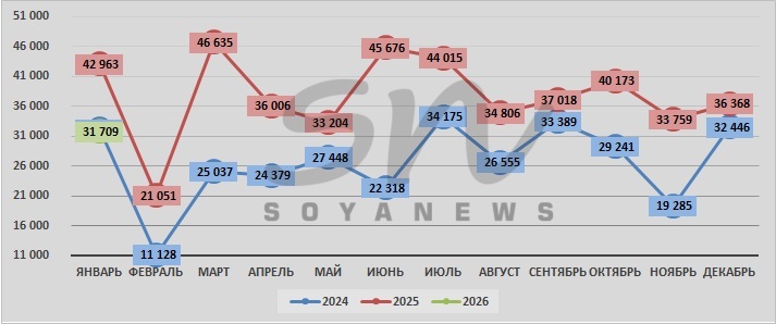 За период с января 2024г. минимальная цена концентратов и кормосмесей зафиксирована в феврале 2024г. (11,1 тыс.руб./т), отмечает SoyaNews; максимальной стала цена марта 2025г. - 46,6 тыс.руб./т.