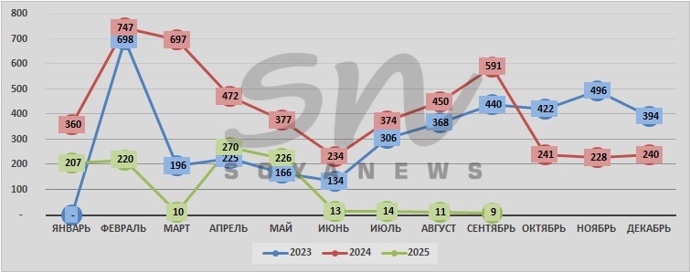 За период с января 2023г. объём производства АВМК, зафиксированный в нашей стране в сентябре 2025г (9 тонн) стал минимальным, обращает внимание SoyaNews. При этом в январе 2023г, согласно данным Росстата, АВМК не производились вообще. Максимальный же объём АВМК произведен в феврале 2024г. - 747 тонн.