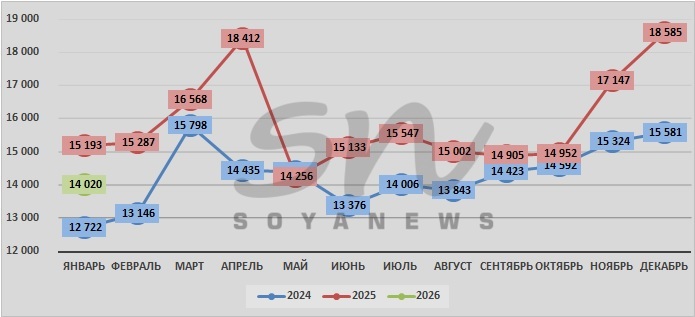 За период с января 2024г. объём производства БВМК, зафиксированный в нашей стране в январе 2024г. (12,7 тыс.тонн) стал минимальным, обращает внимание SoyaNews. Максимальный же объём БВМК произведен в декабре 2025г. - 18,6 тыс.тонн.
