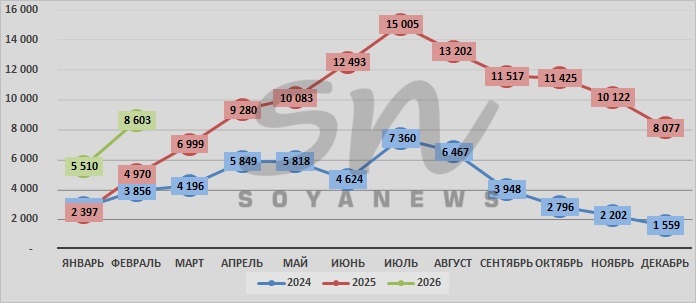 За период с января 2024г. максимальный объём производства комбикормов для рыб был достигнут в июле 2025г. (15 005 тонн), уточняет SoyaNews. Минимальным стал объём производства декабря 2024г. - 1559 тонн.