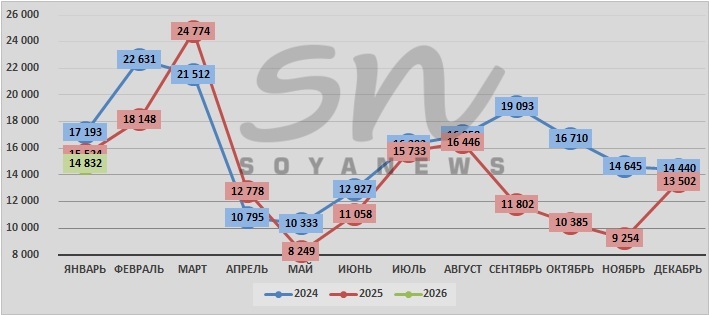 За период с января 2024г. минимальный объём производства рыбной муки зафиксирован в мае 2025г.: 8,2 тыс.тонн, отмечает SoyaNews; максимальный - в марте 2025г.: 24,8 тыс.тонн.