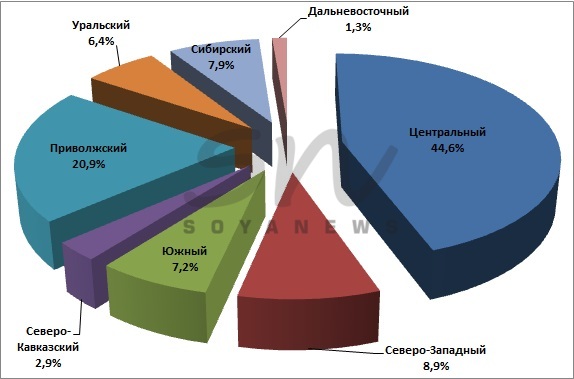 Структура производства комбикормов в России по федеральным округам (по годовым данным 2025 года) |