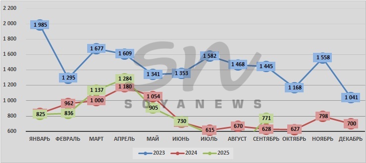 За период с января 2023г. максимальный объём производства ЗЦМ зафиксирован в январе 2023г. (1985 тонн), отмечает SoyaNews; минимальный - в августе 2025г.: 379 тонн.