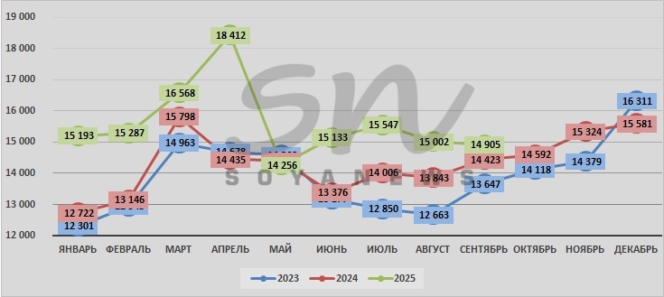 За период с января 2023г. объём производства БВМК, зафиксированный в нашей стране в январе 2023г. (12,3 тыс.тонн) стал минимальным, обращает внимание SoyaNews. Максимальный же объём БВМК произведен в апреле 2025г. - 18,4 тыс.тонн.