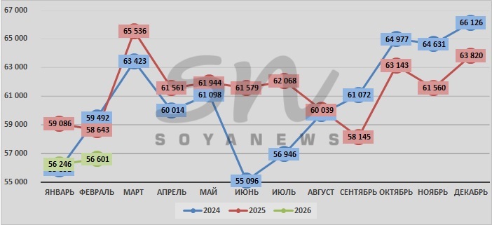 За период с января 2024г. минимальный объём производства мясокостной муки в России зафиксирован в июне 2024г. - 55,1 тыс.тонн, обращает внимание SoyaNews; максимальным стал объём производства, достигнутый в декабре 2024г. - 66,1 тыс.тонн.